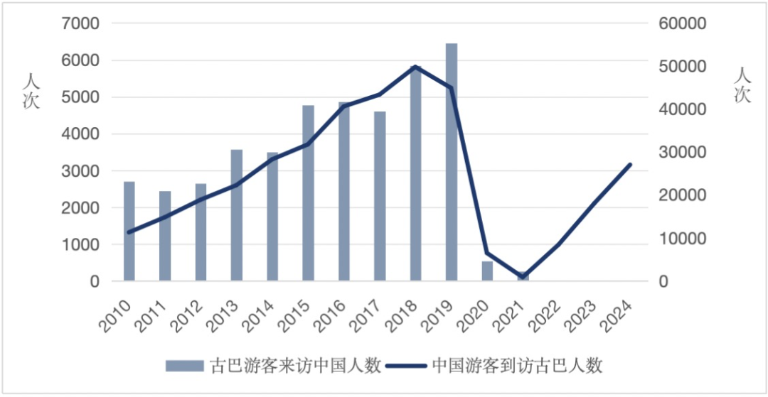 图1:2010-2024年中国和古巴游客往来数据